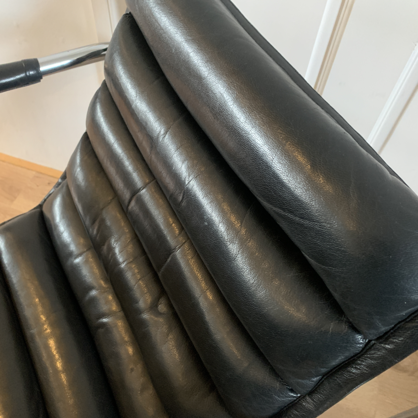 This is a beautiful and rare Baroumand Designs lounge chair, featuring a sleek tubular chrome frame and ribbed black leather upholstery. Its low-slung silhouette and sculptural lines embody the best of 1970s–80s modernism. Perfect as a statement piece in a living room, office, or design collection.